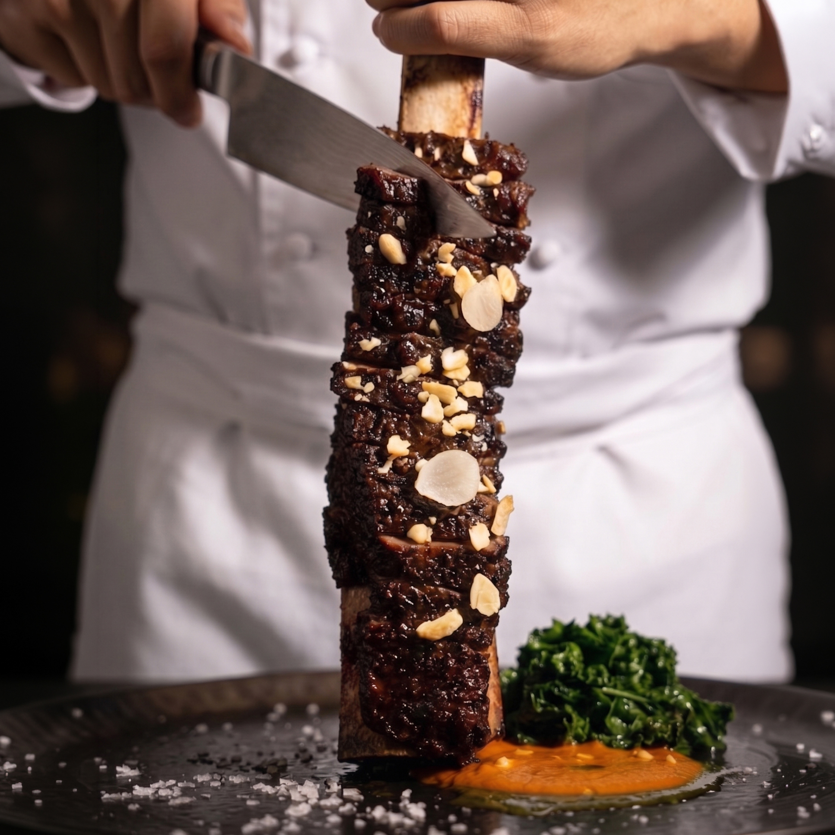 嚴選美國Prime等級帶骨牛小排,以韓式醬油、韓式辣椒醬、蘋果泥、蜂蜜與辣椒等多種醬料醃製12小時後直火炭烤,充滿濃郁肉香與微辛尾韻